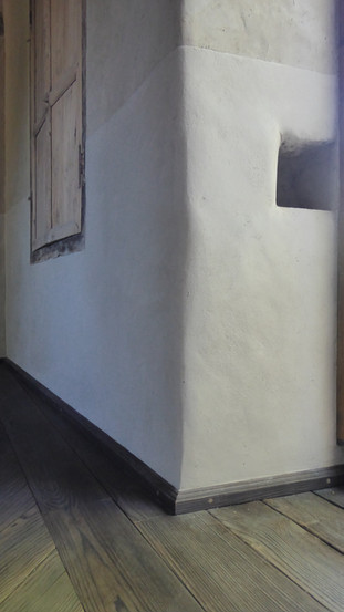 Inspirations Wabi-Sabi ? si vous voulez..... Plafond et murs enduits à la terre, intérieur de placard au stuc de chaux. Choix d'un sous-bassement plus clair que le haut de mur pour que la plinthe, des plus discrête, se fonde avec le plancher bois. Un certain calme se dégage de l'ensemble, idéal pour une chambre...